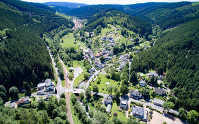 Schwarzmühle im Schwarzatal. Lufbild aus Juni 2017. Mit auf dem Bild und auch in der virtuellen Tour zu sehen, das Flair Hotel Waldfrieden. 360 Grad Tour